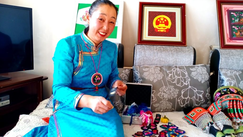 她从7岁开始先后跟着奶奶,姑舅奶奶和母亲学习刺绣,17岁的时候就成为了达拉特蒙古族传统刺绣的行家高手,被人们称为绣女、巧媳妇。她的刺绣一直保留了达拉特蒙古族刺绣的特色与风格,凡是见过用过她刺绣作品的老者都会竖起拇指夸奖。