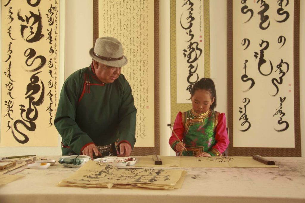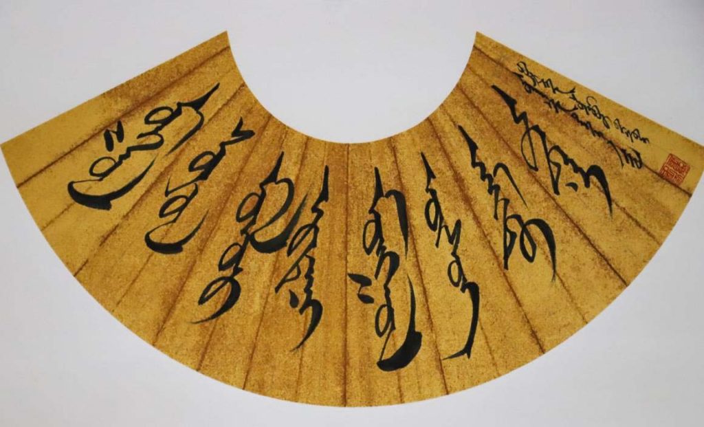 该项目2019年被列入旗级非遗项目名录。因我旗蒙古文书法家众多,至此还未鉴定传承人。世界上唯一将古老文字作为艺术的是中国,这门艺术叫书法,成为中国十大国粹之一。蒙古文书法与历史悠久的汉文书法相比,尚属一门年轻的艺术。然而它从诞生时起,就形成了使用软笔(毛笔)、硬笔(竹笔、羽翎、骨签)书写的蒙古文书法艺术。蒙古文书法在其艺术表现手段上虽有其自成体系的独立性,具有这种独特的象形结构,如运用书法艺术功力,经过艺术构思、巧妙布局、书写得体。然而在长期的与汉文化艺术,特别是汉文书法和绘画艺术(水墨画)的相处中,自然而然地受到影响或在借鉴中吸取营养,从而使蒙古文书法在再现手法及表现形式上发生审美范畴的共通。符合蒙文书法本身的逻辑规律。