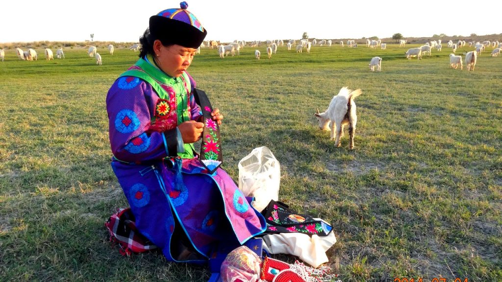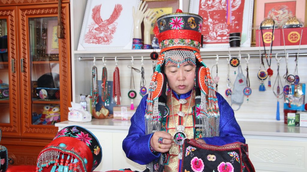 从小受到母亲孜孜不倦的熏陶和栽培下,开始勤学苦练,不管是放羊还是吃饭总要抽着空就绣几针,为做完一个绣品经常一绣就是大半夜,手指绣破了,眼睛绣肿了,第二天放羊时还要带上继续绣,不管是打背背,还是施绣,她总是严格要求自己,在不断地学习和总结中,她把蒙古绣从多层衬应用到单衬布上,从常规的马海、手提包、各式男女帽子、头带、腰带,蒙古坎肩,蒙古袍上,到如今从生活用品发展到陈列品。