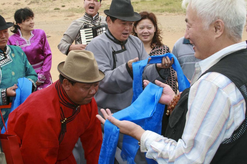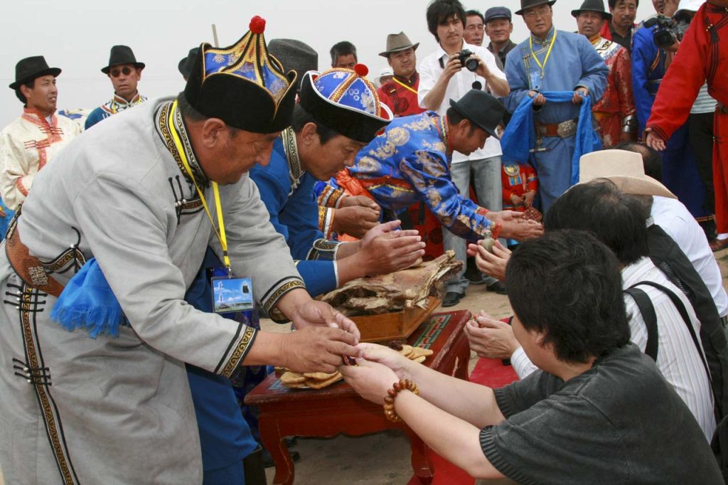 如果您到鄂尔多斯蒙古人家里做客,会受到盛情款待。蒙古族十分注重礼俗,待人接物皆彬彬有礼,温文兼恭让。迎接贵客、婚丧嫁娶、丰年过节、敬神祭祖、最隆重的礼节就是防五茶。五茶的含义是,献哈达、喝奶茶、尝鲜奶、摆羊背子、敬美酒。