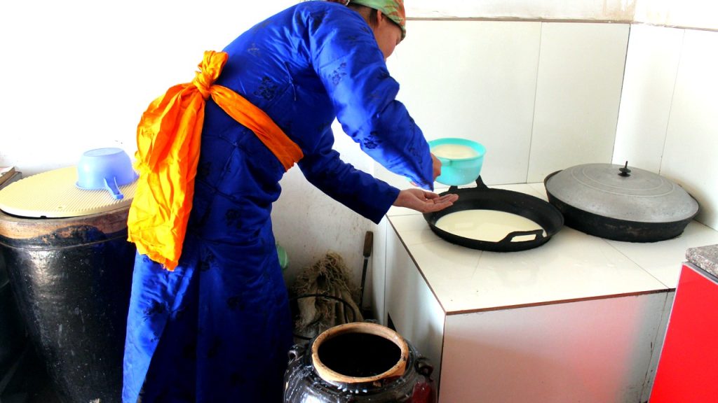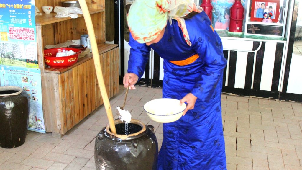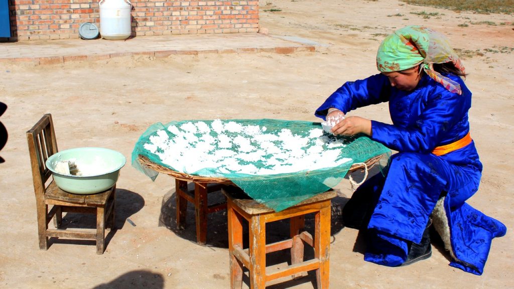 受姥姥、母亲的影响希吉日图雅从小接受奶食品饮食文化的陶冶,自幼学习挤奶、咚奶,每天跟着父母收 羊、挤奶、饮羊。放羊,之后慢慢学会了制作酥油、奶皮、 奶酪等技能。奶食品是通过发酸奶、取白酥油、熬制酸奶、制作奶酪、炼制黄酥油、揭奶皮等多种程序制作而成,蒙古奶食品在蒙语中称“查干意德”,意为白色的食品,蒙古人以 白为尊,视乳为高贵吉祥之物。奶食也被本民族视为 珍品,每逢拜年、祝寿、招待宾客、喜庆宴会等首先 以品尝奶食、敬献奶酒为最美好的祝愿,这是一种神 圣的礼节。奶食品中含有大量的氨基酸、蛋白质、油 脂、微量元素,对人体机能有着不可缺少的营养成分, 增强免疫力,有着强壮、保健作用。