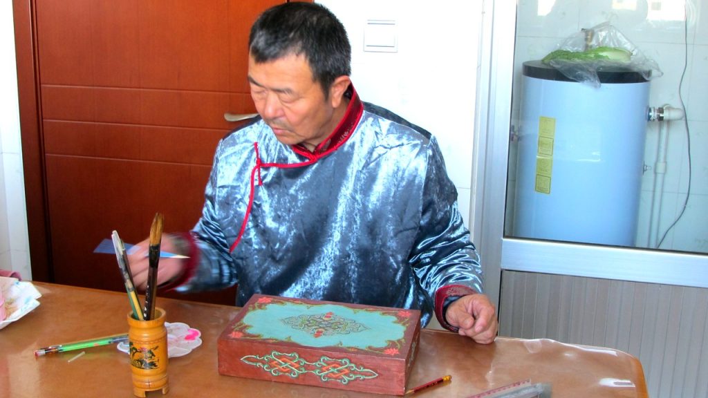 跟阿日斌毕力格老人学习木匠技能,通过一年半的刻苦实践中基本掌握了木器制作的基本几何演变引用,从此,给自己和他人制作车厢,门窗,桌椅,柜箱,盒盘等日常使用器具,后来为了器具的美观,自己学习了平板木雕技术,多年来不断实践中探索和钻研,技能提高,制作出《双骏》,《满园春色》,《富贵》,《马群》,《藏头诗》和原件,镂空木雕器具等棘手作品。