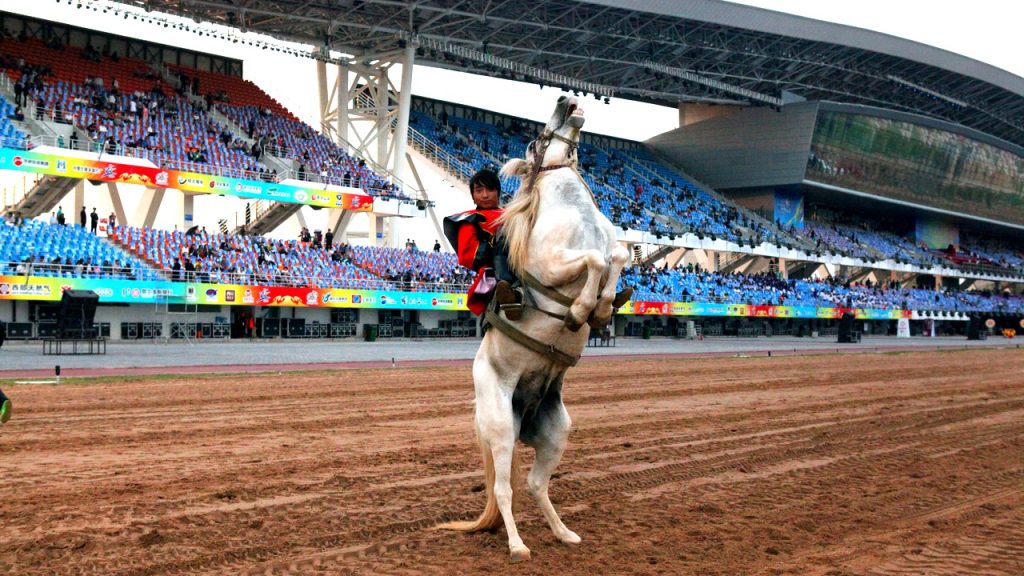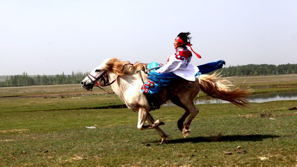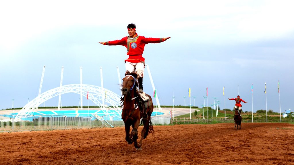 蒙古族传统技巧马术表演是一项蒙古族传统体育运动项目 的延伸和发展,是古代骑术与现代审美形式的完美结合,其中马 上技巧以马为载体、在全速奔跑的马背上运动员在马背上做出各 种各样的高难度动作、造型,甚者一匹多人、多匹马多人的高难度动作。