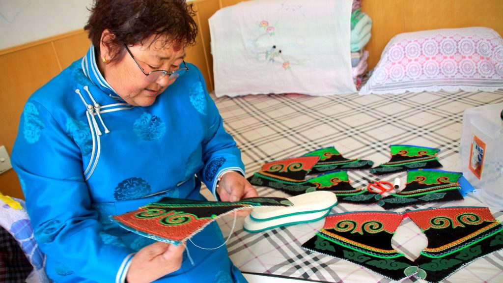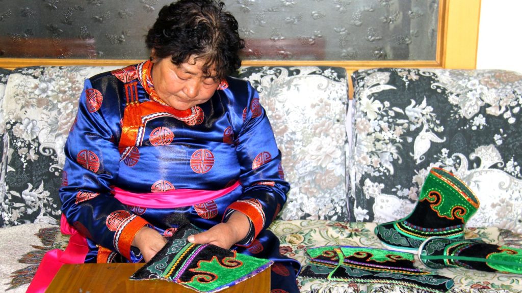 1990年至2009年跟母亲学蒙古马靴制作技艺,并每年组织嘎查牧民妇女做蒙古马靴,特点是 鄂尔多斯马靴(马海)的样式古老,靴头粗笨,靴尖上翘,靴筒约1尺多高,筒口宽大,呈马蹄形,靴底较厚,多为千层底,状如船形。制作要经过选料、裁剪、粘贴、刺绣、缝补等工序,制成色彩分明、工艺精良、美观大方、舒适实用,极具蒙古族服饰特点的生活必需品,在重大节日庆典上与蒙古袍一起穿着。