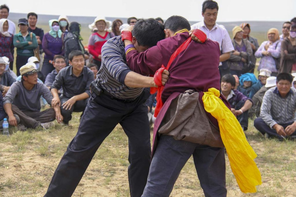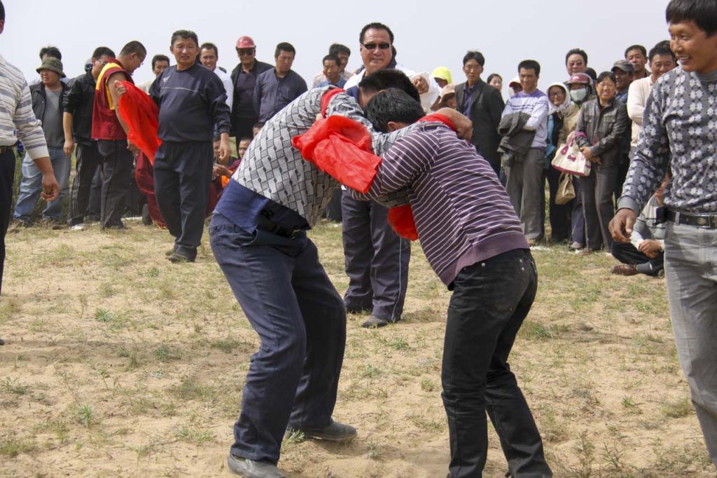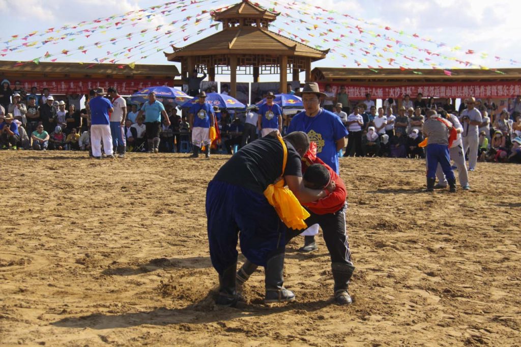 鄂尔多斯搏克,可译为“鄂尔多斯式摔跤”。它完全与蒙古式、中国式、国际式、自由式摔跤不同,是一种固定式、抓手式的摔跤方式。鄂尔多斯搏克不穿摔跤坎肩或专门服饰,就要两条6尺长的绸布腰带。因此,亦称其为“布斯搏克”。腰带可用其它条状物(绳索)等替代。正因为如此,这是一种不分年龄、不分体重、不分场地、不分时间的大众化、随意化、自由化的群众传统体育运动项目。