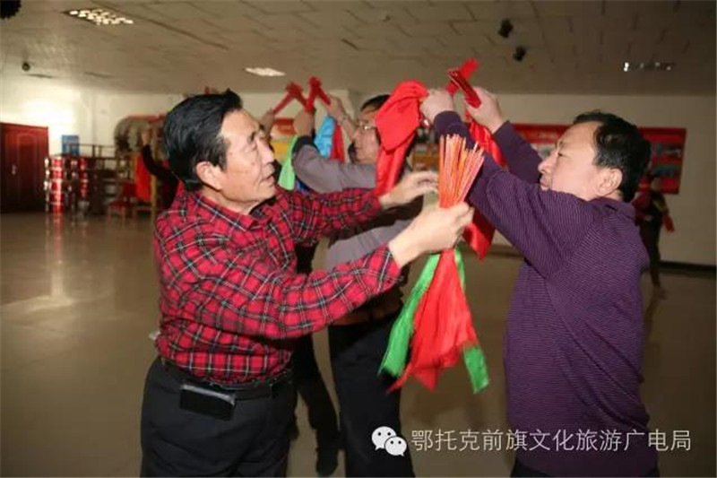 鄂尔多斯的“筷子舞”,原属于民间自娱性质的舞蹈,主要流行于现鄂尔多斯市鄂托克前旗。舞者右手握一把筷子敲击手掌、肩部、腰部、腿部等处。击打时肩部环绕耸动、腕部翻绕灵活,敲打的声音清脆,节奏鲜明,情绪热烈欢快。舞者时而转身打地,时而蹲跳打脚,各种动作基本上保持着蹲的舞蹈姿态。“筷子舞”的伴奏乐器有三弦、四胡、笛子、扬琴等,伴唱的歌曲用鄂尔多斯各旗区流传的民歌,以4/4拍、2/4节拍居多,表演往往是由慢转快,或原地、或进行,最后在快速表演的高潮中结束。