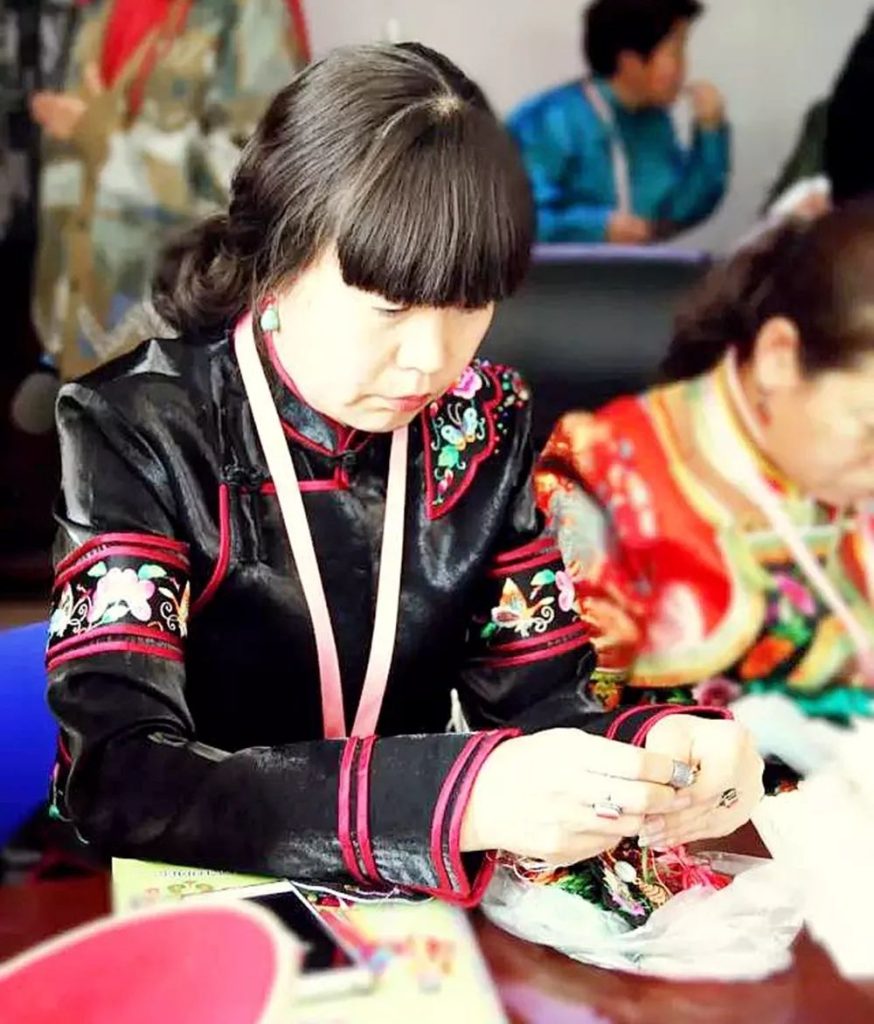 额仁其其格、女、蒙古族、1968年12月出生于乌审旗乌审召镇牧民、大专学历、自治区级非物质文化遗产项目-蒙古族刺绣(鄂尔多斯刺绣)(第三批),自治区级第六批代表性传承人。乌审《乌仁布斯贵》刺绣团队创始人。2019年被评选为内蒙古自治区“最美绣娘”。