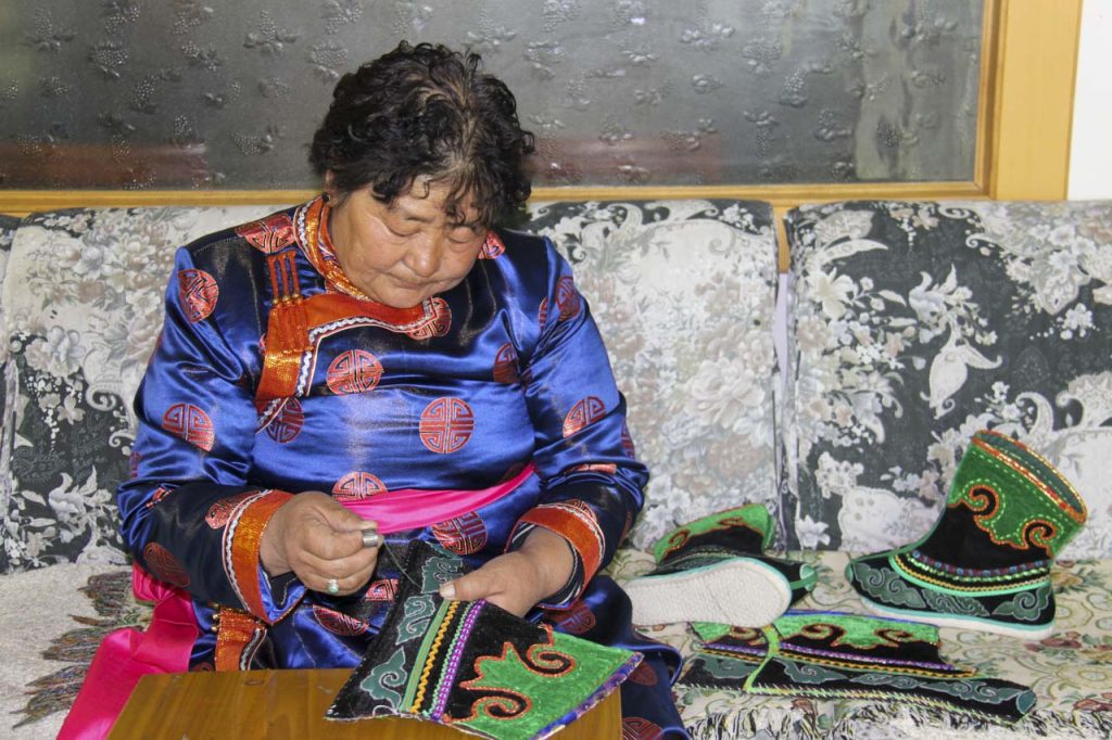 马海制作主要靠手工完成,制作者多为蒙古族妇女,一双成品的马海需要经过数道复杂的制造工艺才能完成。首先,布料需要被切割成完整对称的两块靴勒,手工将两面靴勒缝合,并将经数次打磨制成的靴帮缝合至靴底部分,才能完成马海的初步造型做工;其次,需要制作者高超的缝纫刺绣技术,包括补绣(补花)、盘绣(盘花)等手法进行纹样缝制。其中盘绣(盘花)用料考究加工精细且针法独特,以照色纯棉布做底料,用红、黄、绿、蓝、白等七色绣线在上面绣制,配色协调,缝制时也需上针盘,下针缝,一针二线,可局部使用也可大面积绣在靴体上,虽费工费料,但成品纹路清晰,厚实华丽,经久耐用,补绣(补花)也是制作马海的主要手法,将画好的图案纸样按缝制结构剪成若千小块,并在窝边剪出若干小豁口后把窝边回贴好,按原图的结构位置贴在已经画好图案轮廓的服饰裁片的指定位置上;最后用同色丝线把边固定缝合,缝制出纹样自然和谐,其装饰繁复。